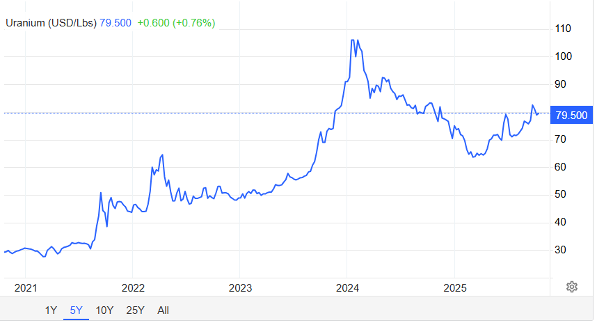 This projected shortfall supports higher spot prices for a long-term bull run. Recently, uranium markets experienced a strong resurgence in May, largely due to a significant acceleration in U.S. nuclear energy policy and renewed industry confidence. Although year-to-date performance has been modest, uranium spot prices are still at a multi-decade high.